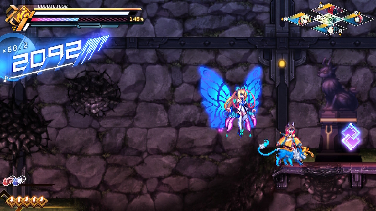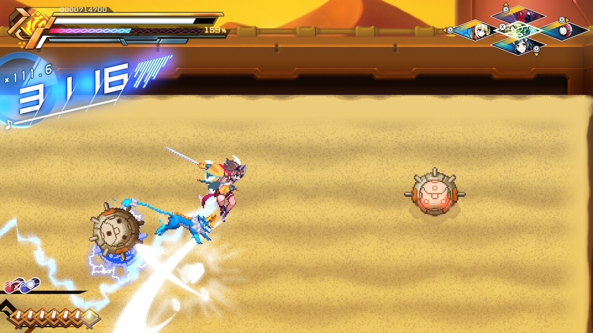 そのため、滞空アクションを織り交ぜて上手く空中に留まりながら先にショットで敵のHPを削り、トドメでワープ斬りを行うなどといった、本編とはまた一味違う、ややテクニカルなアクション性になっています。