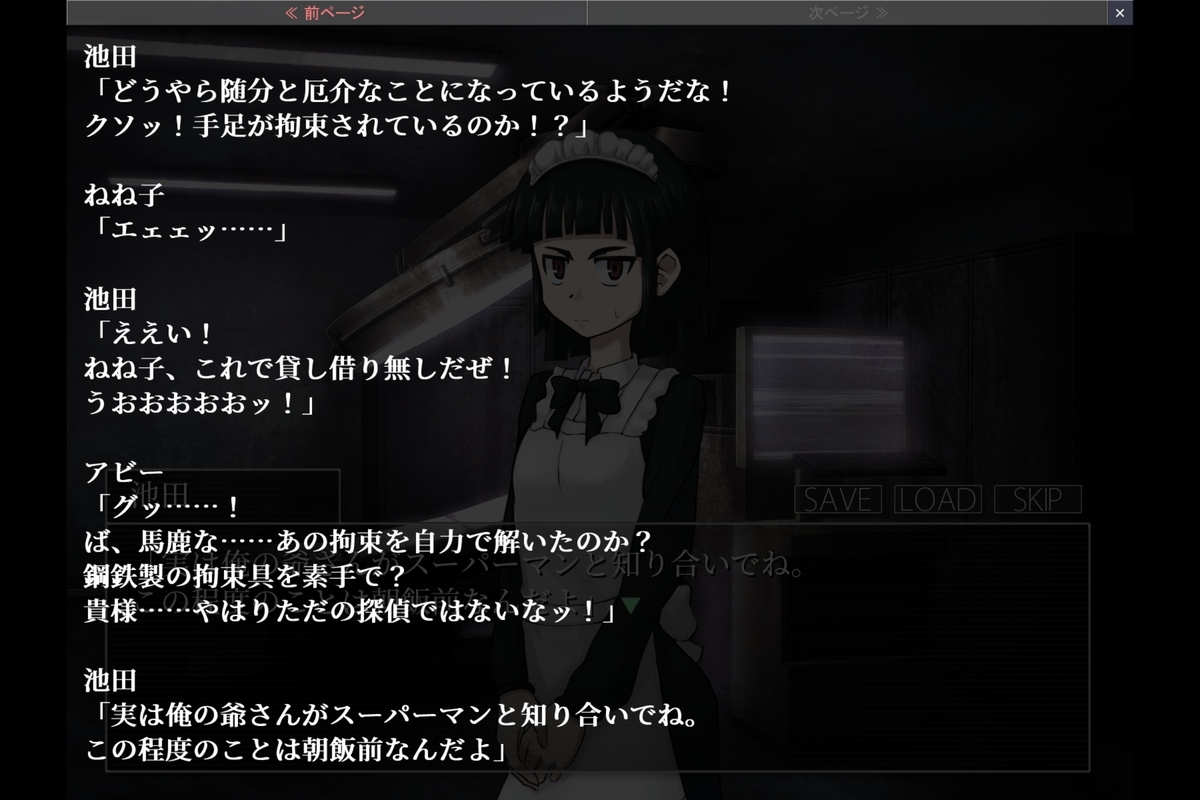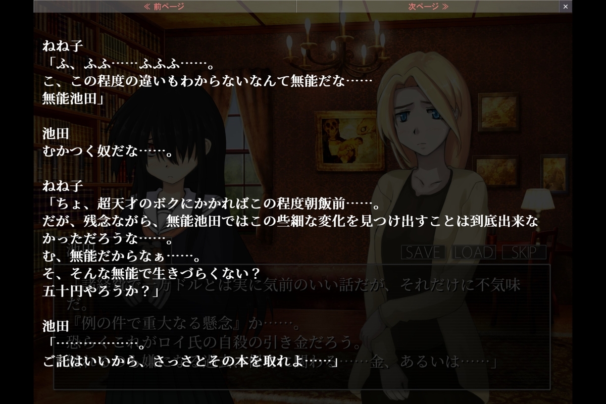 予知夢で見た死の運命から主人を救うべく、屋敷内を調査し、証言や証拠を集めて事件を未然に防ぐ、というのが大まかなゲームの流れ。簡単な逆転裁判みたいな感じですね。
