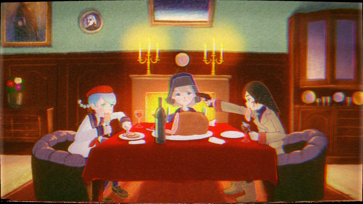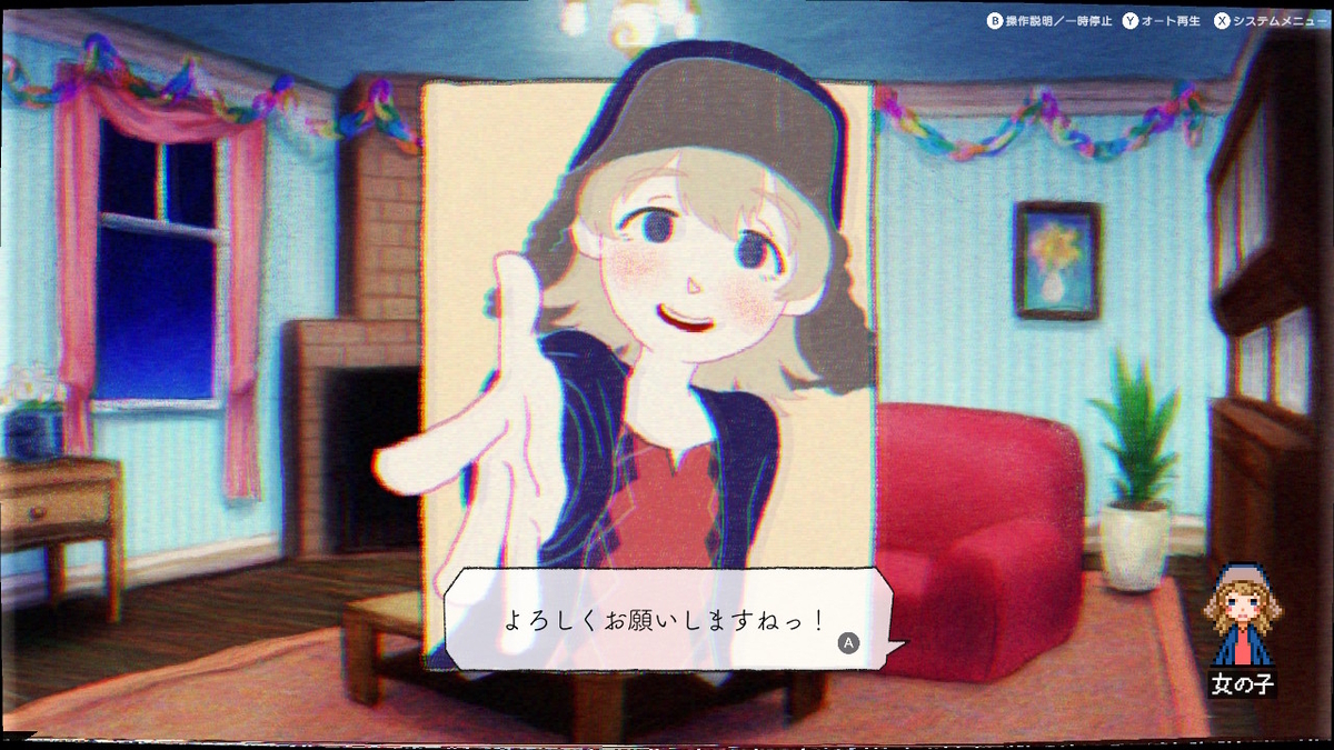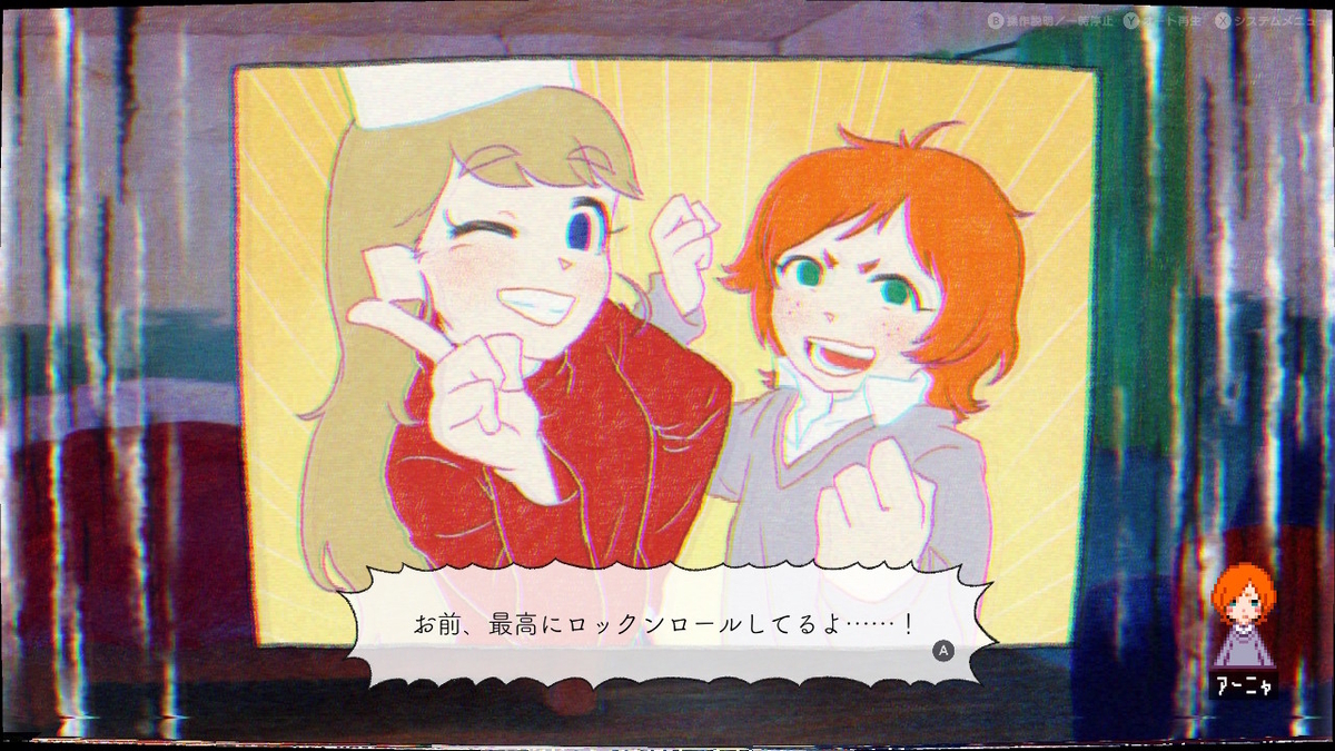 絵本のような温かみのある絵柄と、ブラウン管のようなグリッチノイズという異色の組み合わせによる独特のタッチも目を引きます。